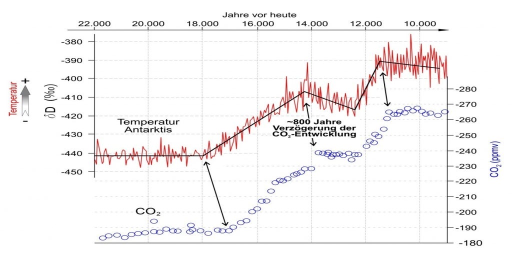 CO2-Konzentration in der Atmosphäre wird normalerweise aus der jeweils vorherrschenden Temperatur berechnet.(simuliert aus O2-Isotopen 160/180